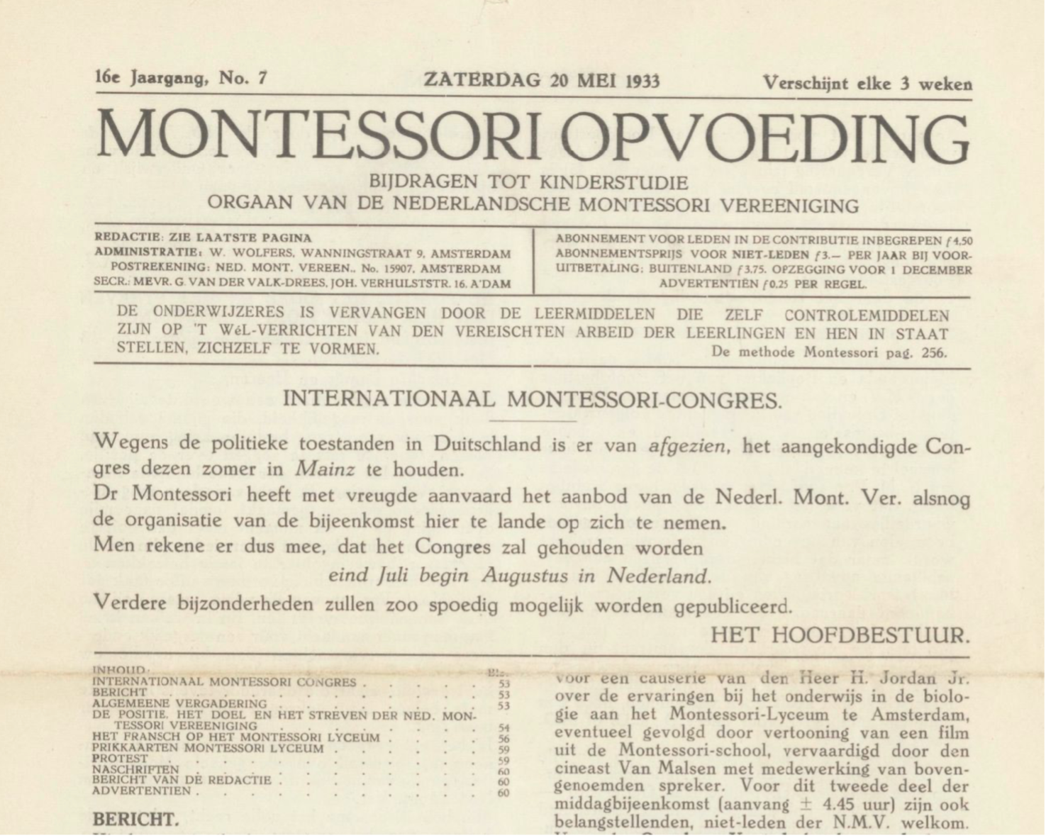 Mit dem anstehenden Internationalen Montessori-Kongress, der Ende Juli 1933 in Mainz stattfinden sollte, musste sich der Vorstand der Niederländischen Montessori-Vereinigung (NMV) erstmalig am 22.04.1933 beschäftigen. (Alle hier aufgeführten Informationen entstammen Dokumenten aus dem Amsterdamer Stadtarchiv.)